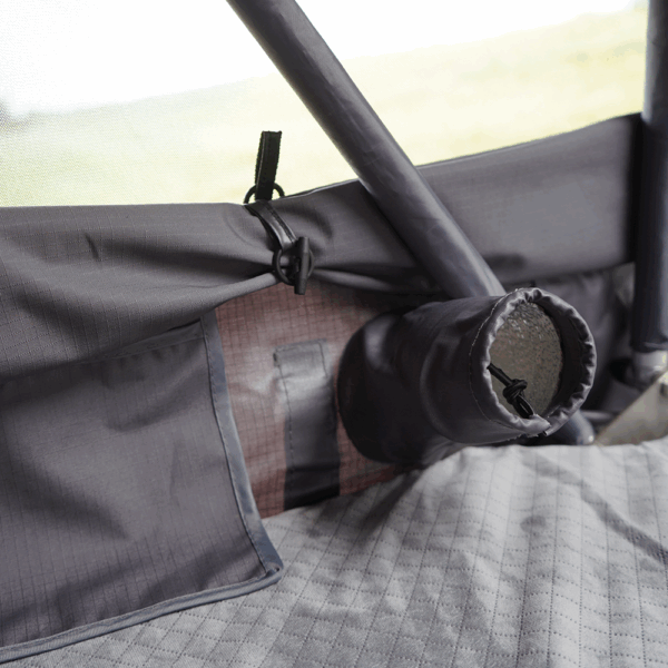 - Ferestre laterale cu plase de insecte, asigurând ventilație adecvată și protecție împotriva insectelor.