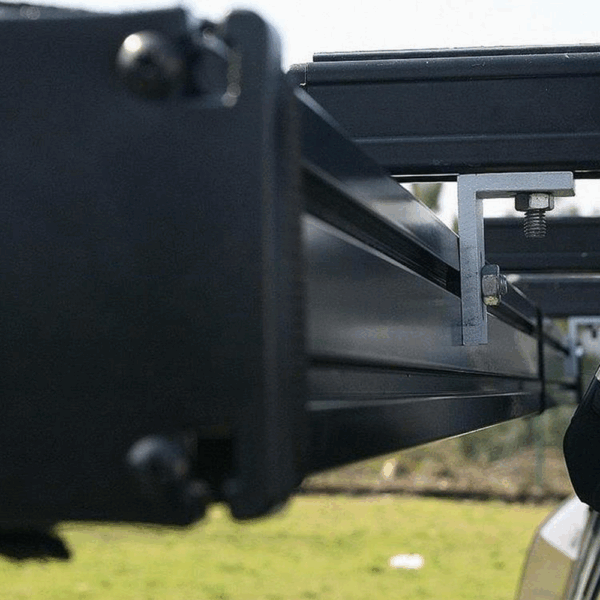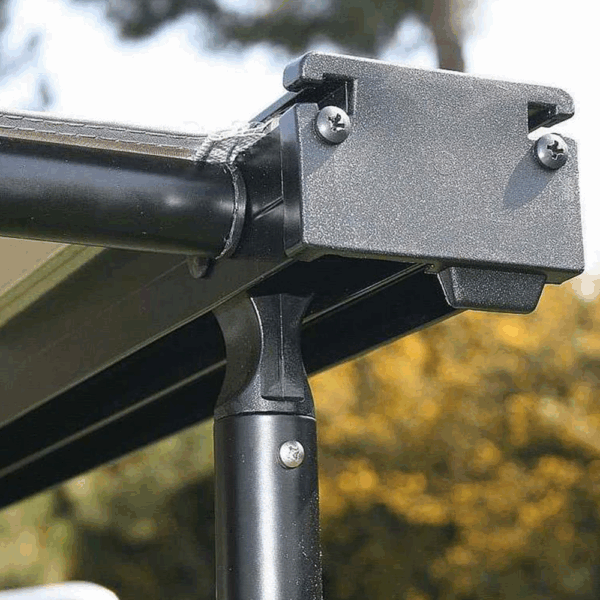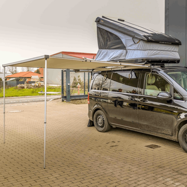 Un detaliu rafinat îl reprezintă cele două șine continue în formă de „C” integrate pe partea vehiculului, care simplifică montajul prin utilizarea șuruburilor hexagonale și a unghiurilor de 90°. La demontare, traversele se pliază elegant în profilul de aluminiu al vehiculului, iar picioarele ajustabile se închid în profilul exterior. Marchiza se rulează cu ușurință pe vehicul și este protejată de o husă din prelată PVC durabilă, prinsă discret cu Velcro. Această soluție, la fel de simplă și ingenioasă, reflectă creativitatea bine cunoscută a brandului James Baroud.