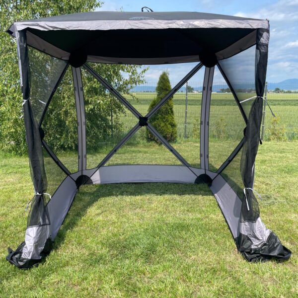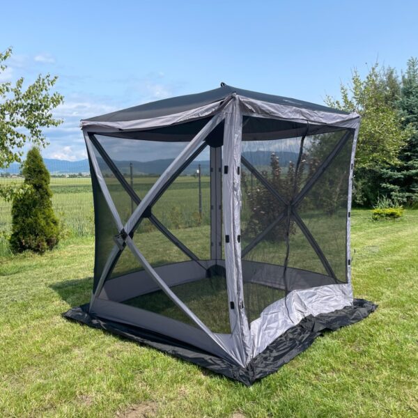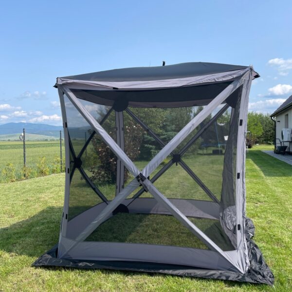 Mecanismul cu tijă din fibră de sticlă permite o montare extrem de rapidă, în doar câteva secunde. Designul ușor și portabil oferă protecție împotriva intemperiilor și este suficient de spațios pentru a găzdui mai multe persoane, o masă și scaune în interior.