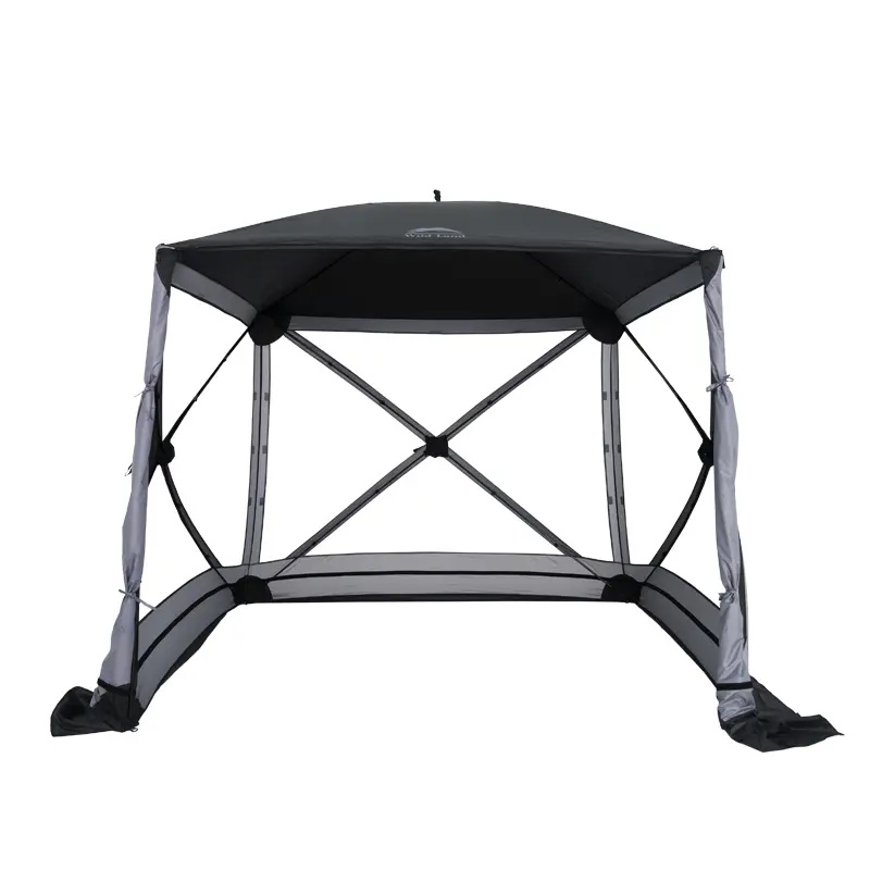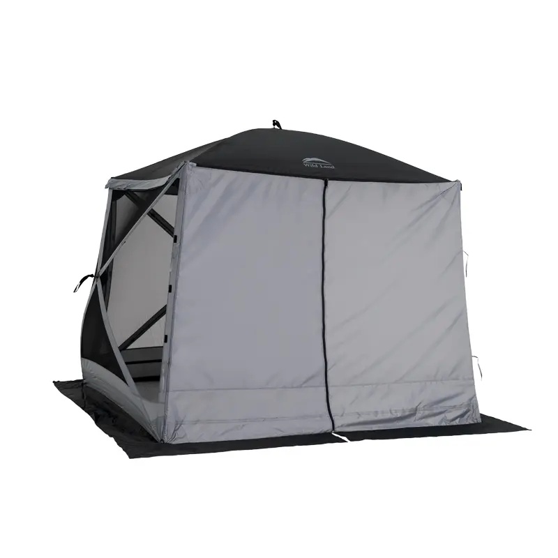 Cort de camping Wild Land cu structură tip hub și design modular – ideal pentru activități în aer liber alături de familie și prieteni. Poate fi utilizat ca foișor deschis, cu patru pereți laterali din plasă pentru ventilație excelentă, sau se pot adăuga panouri detașabile pentru intimitate sporită.