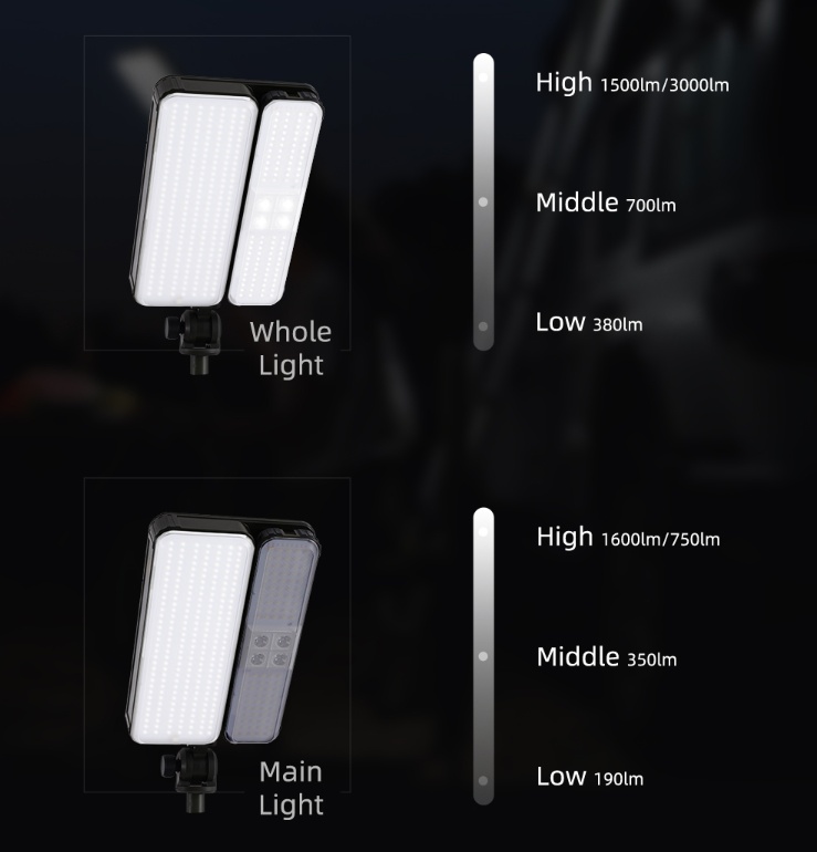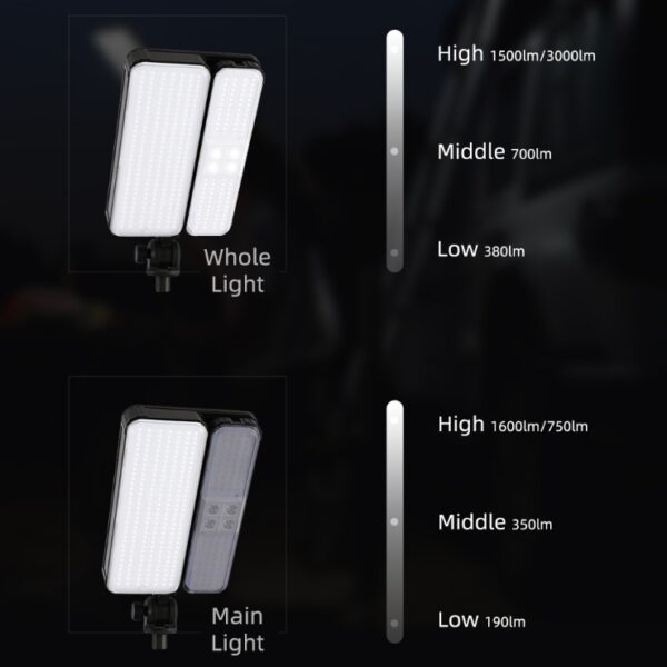 Lampa principală are o autonomie de până la 11,5 ore și mai multe moduri de iluminare, de la scăzut la puternic, în timp ce lampa laterală oferă 5 moduri, inclusiv funcție spot. Întregul sistem este ușor de montat și transportat, cu o greutate totală ce variază între 2,97 și 5,27 kg, în funcție de trepiedul ales.