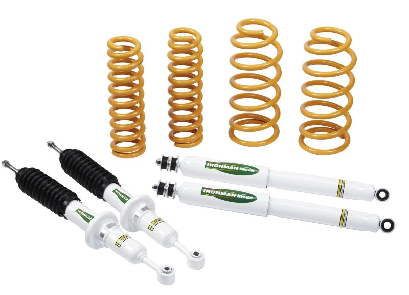 Imaginea indica componenta kitului: 2 amortizoare fata NitroGas strut, 2 amortizoare spate NitroGas, 2 arcuri fata si 2 arcuri spate.