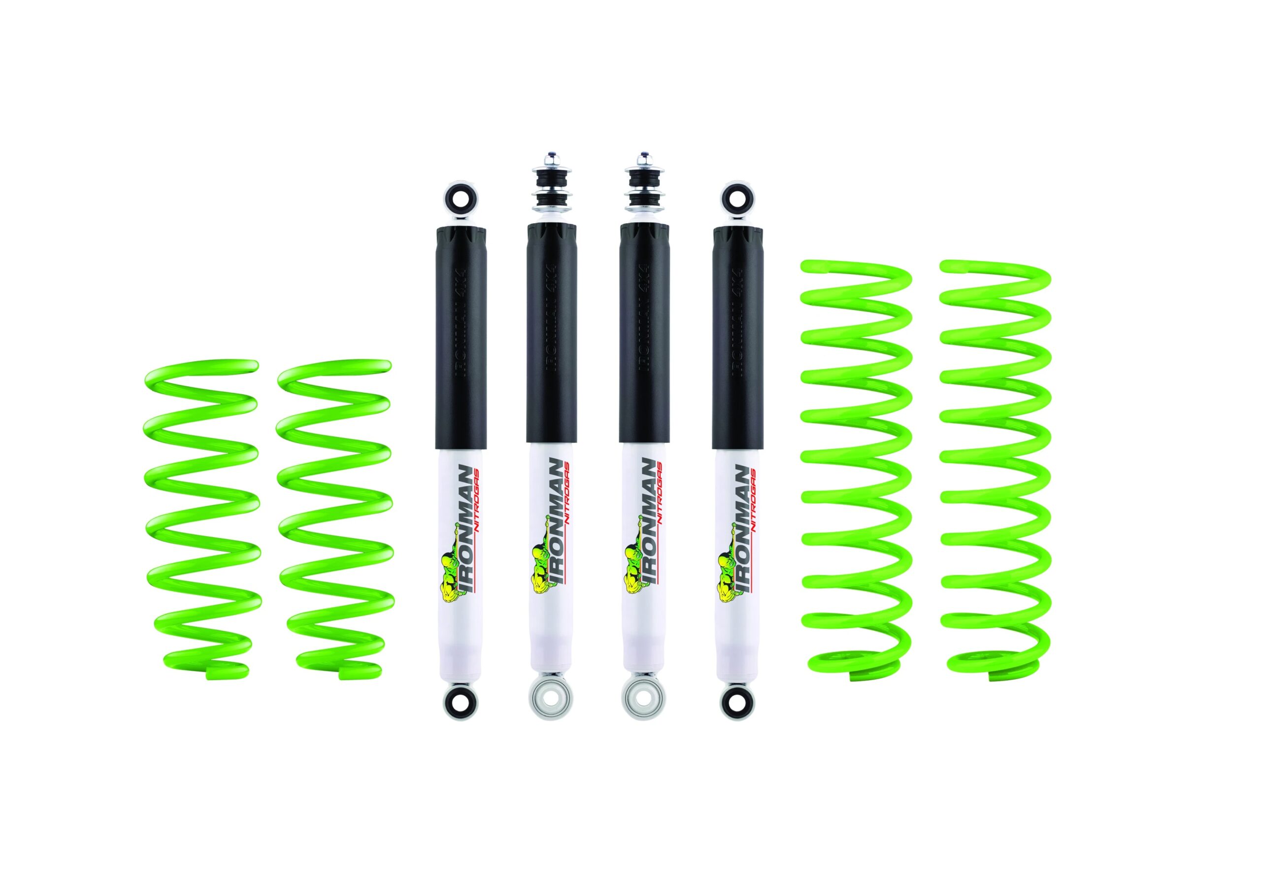 Imaginea prezinta alcatuirea kitului: 4 amortizoare NitroGas, 4 arcuri elicoidale plus kit complet geometrie JKBKITL.