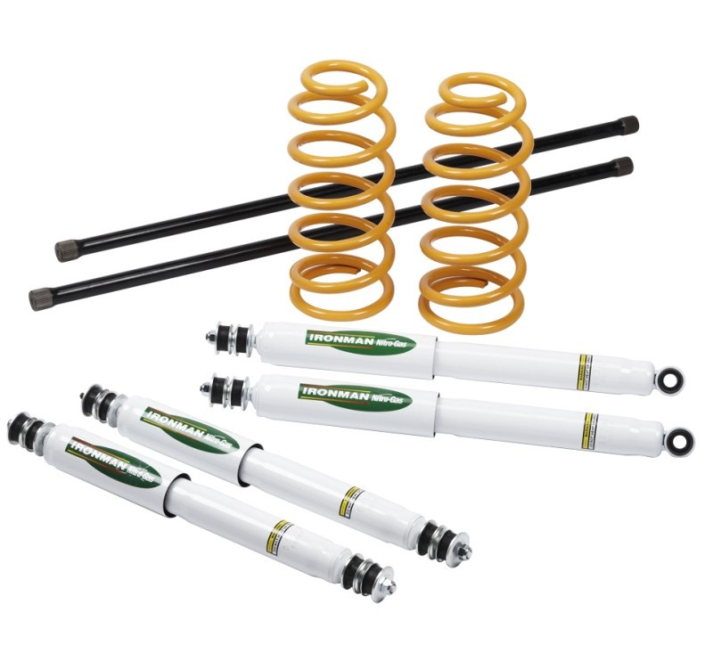 Imaginea prezinta alcatuirea kitului: 4 amortizoare NitroGas, 2 bare de torsiune HD, 2 arcuri elicoidale.