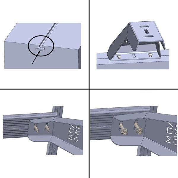 Cea mai sigură și profesională metodă de montaj este fixarea portbagajului în șinele T-slot. Sistemul T-slot permite utilizarea unor elemente de prindere dedicate (șuruburi, bride sau cleme compatibile), care asigură o fixare fermă și uniformă, fără a afecta structura vehiculului.