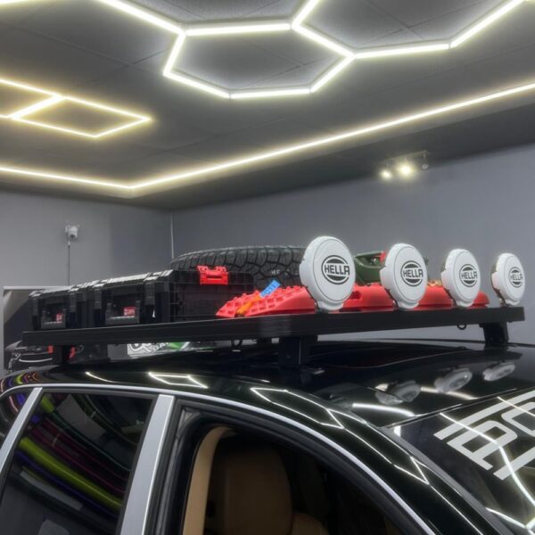 Cu dimensiuni de 135 x 126 cm, acest portbagaj se integrează armonios cu plafonul vehiculului. Barele de legătură sunt prevăzute cu șine T-slot care permit instalarea ușoară a diferitelor accesorii: