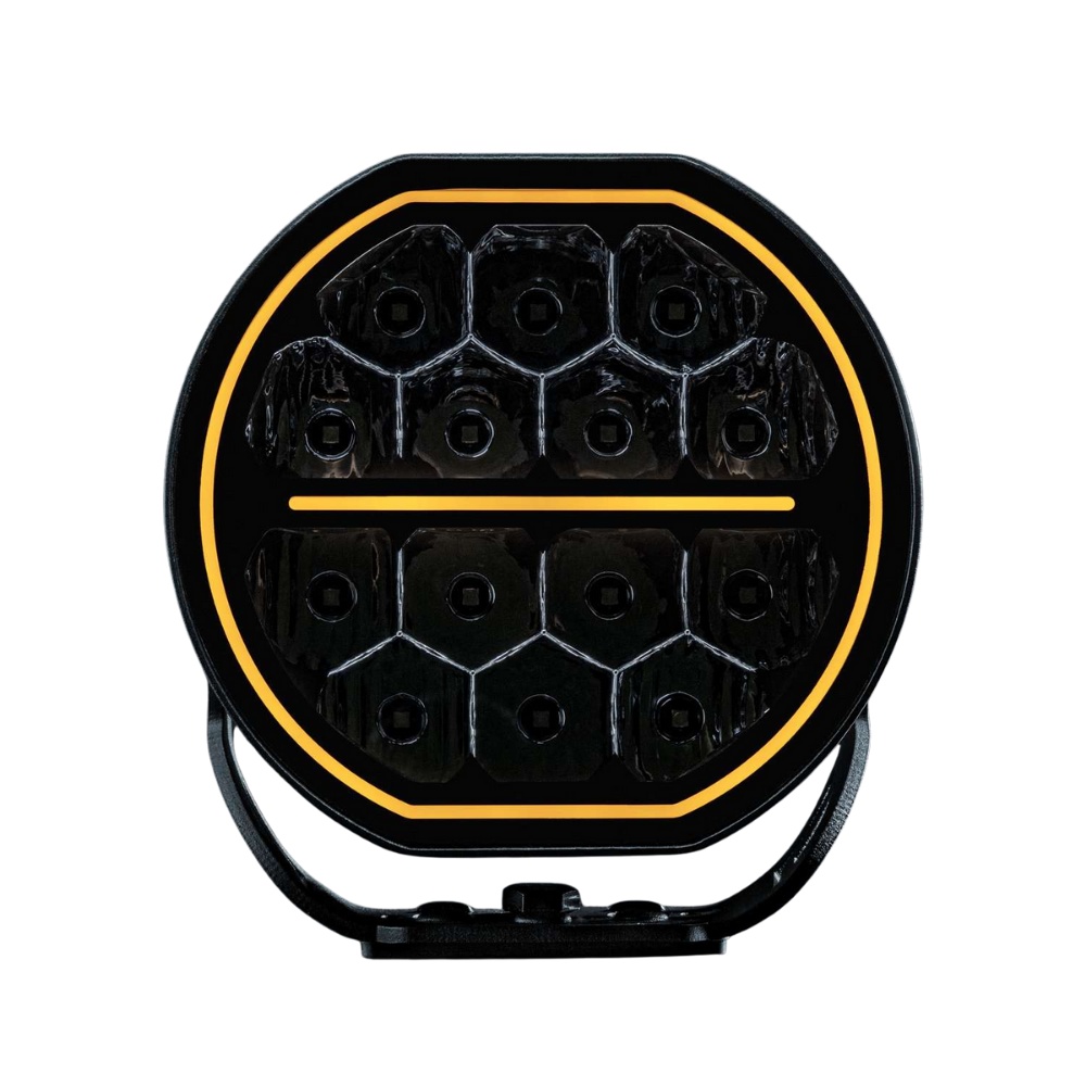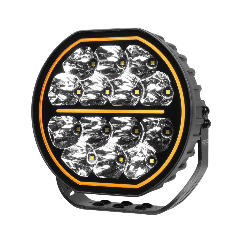 Proiector LED Big Energy 7″, 70W, 5600 lm, rază 465m, 5700K, fascicul optimizat 15,7°, lumină poziție albă și galbenă, carcasă aluminiu negru, lentilă policarbonat, suport inox, rezistent la apă și praf (IP67/IP69K), Strands