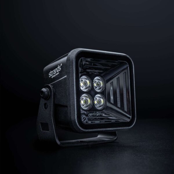 Proiector LED Dark Knight Fortex 85x64x80 mm, 38W, 3200 lm, fascicul flood, lumină poziție roșie, carcasă aluminiu negru, lentilă clar, suport inox, IP68/IP69K, Strands