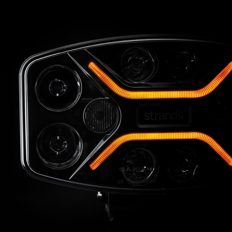 Optica întunecată a modelului Insane, cadrul subțire și lentila fără margini, așa-numita „no edge”, formează o combinație elegantă care asigură o instalare spectaculoasă, indiferent de vehicul. Iluminarea este îmbunătățită de luminile de poziție în două părți, situate deasupra și dedesubtul logo-ului Strands, care pot fi setate fie pe portocaliu elegant, fie pe alb tradițional.